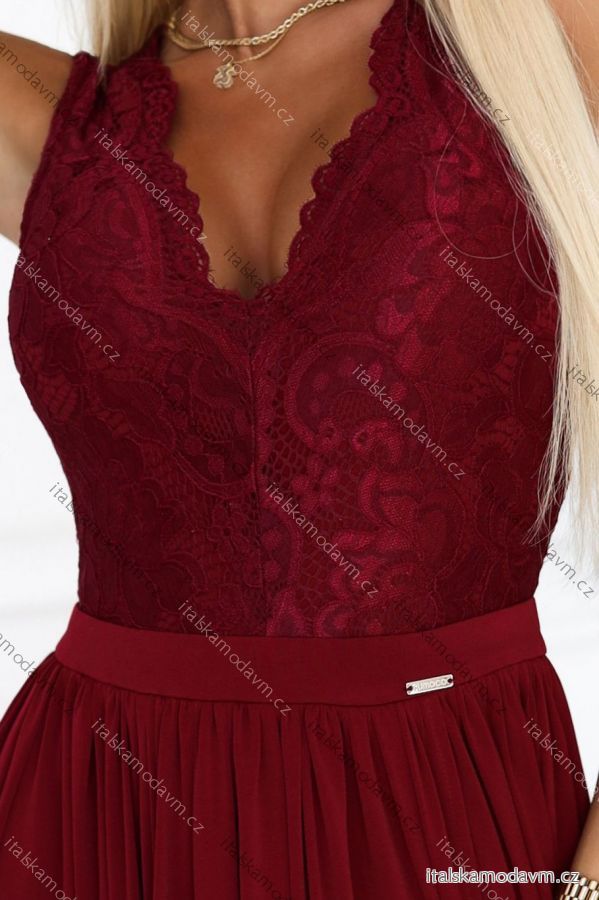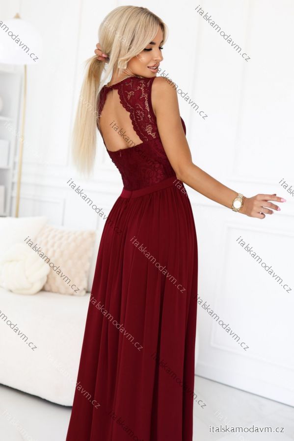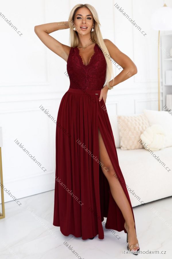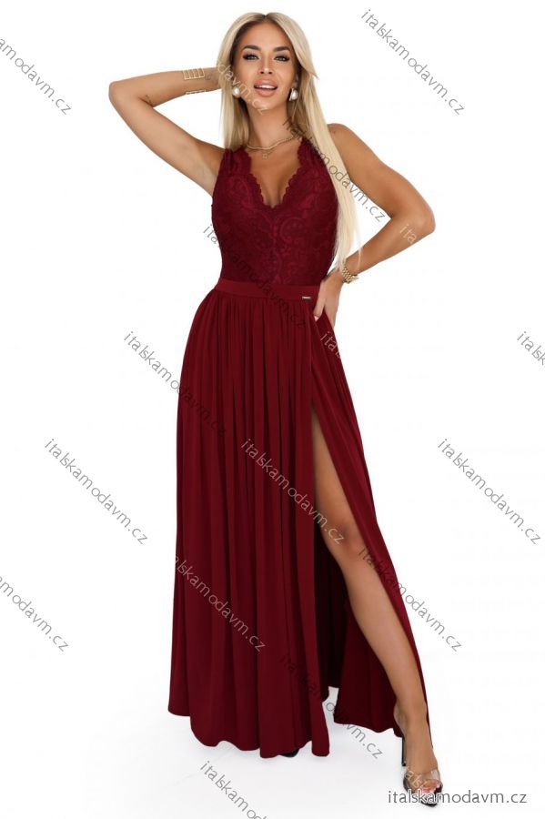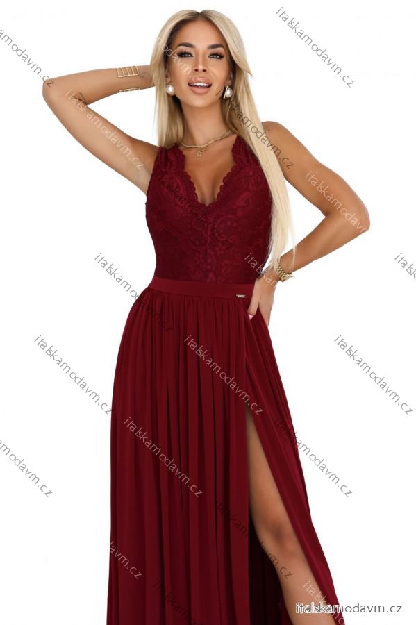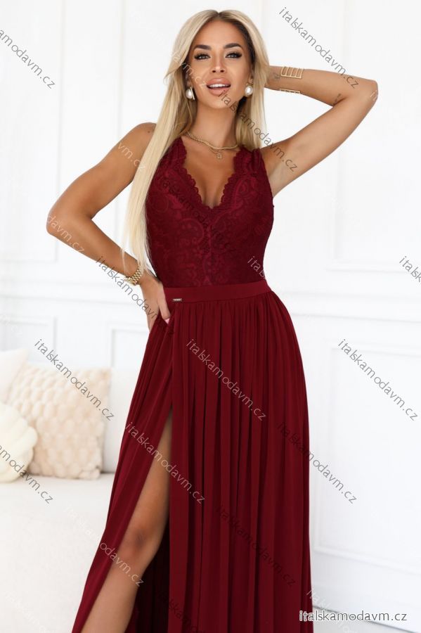 ZBOŽÍ (22075) > 211-8 LEA dlouhé šaty s krajkovým výstřihem a rozparkem na nohavici - vínové