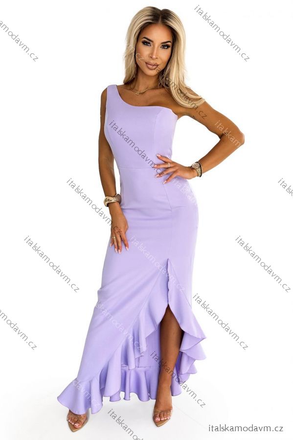 ZBOŽÍ (23042) > 317-6 Dlouhé levandulové šaty s volánky a asymetrickým výstřihem