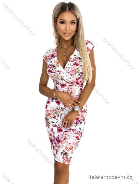 Boyka - vypasované šaty s obálkovým výstrihom a krátkymi rukávmi. Prevedenie: ružové a fialové maľované kvety. Značka Numoco . Poľská výroba.