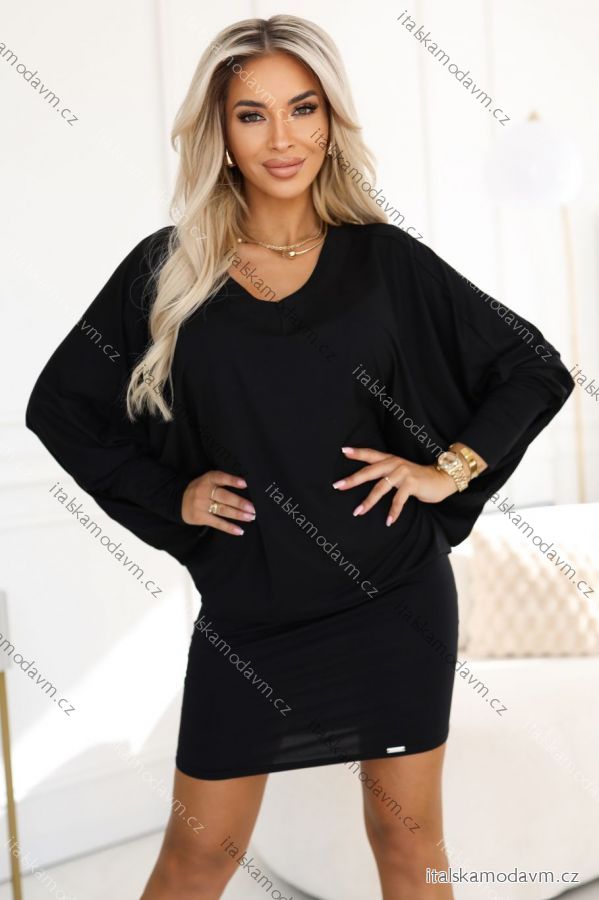 402-10 Pohodlné šaty s dlhými rukávmi a vzorom netopiera - čierne