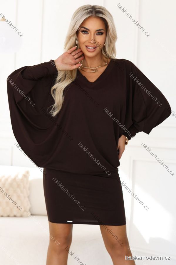 402-9 Pohodlné šaty s dlhými rukávmi a vzorom netopiera - čokoládová