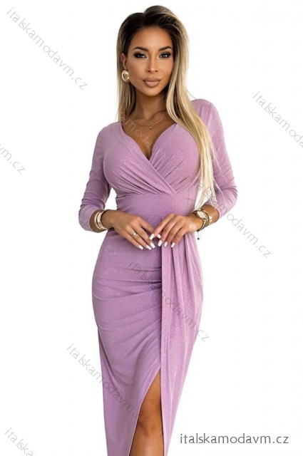404-10 Lesklé šaty s výstřihem a rozparkem na nohavici - špinavě růžové se třpytkami