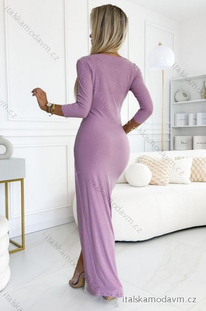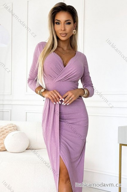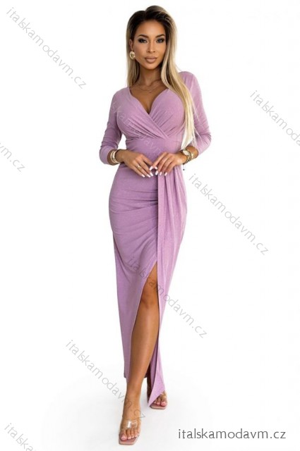 404-10 Lesklé šaty s výstrihom a rozparkom na nohavici - špinavoružové s trblietkami