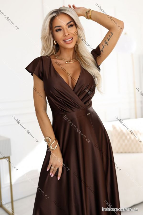 411-15 CRYSTAL saténové dlouhé šaty s výstřihem - čokoládové