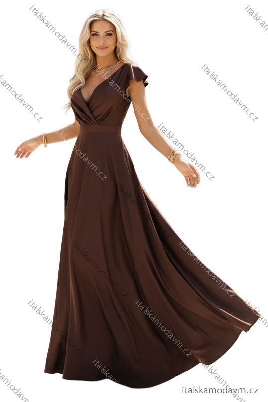 411-15 CRYSTAL saténové dlouhé šaty s výstřihem - čokoládové