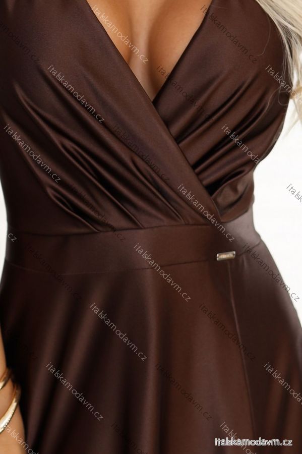 411-15 CRYSTAL saténové dlouhé šaty s výstřihem - čokoládové