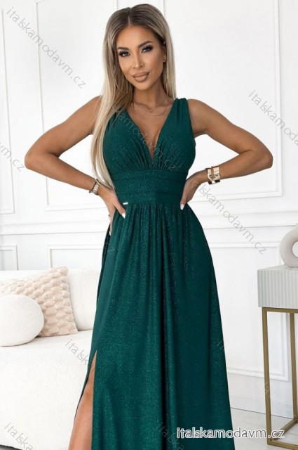 SUSAN - dlhé šaty s výstrihom, rozopínaním na nohavice a prešívaním v páse. Z elastického materiálu s trblietkami - zelená. Ideálne na svadby, Silvestra, ples alebo karneval. Poľský výrobok. Značka Numoco.