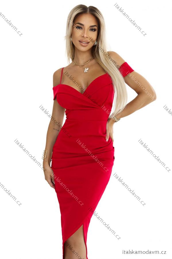 564-10 CALLIE Midi šaty s odhalenými rameny a výstřihem - červené