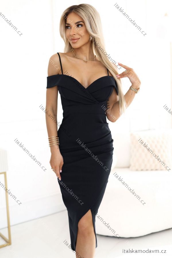 564-11 CALLIE Midi šaty s odhalenými rameny a výstřihem - černé