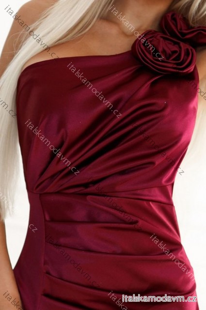 ZBOŽÍ (22028) > 580-2 AURORA dlouhé saténové šaty na jedno rameno s růží - vínové