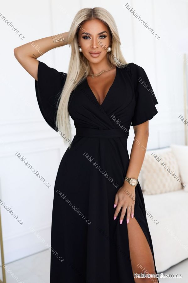 581-7 Dlhé šaty JENNIFER s rozparkom na nohaviciach, rukávmi a výstrihom - čierne