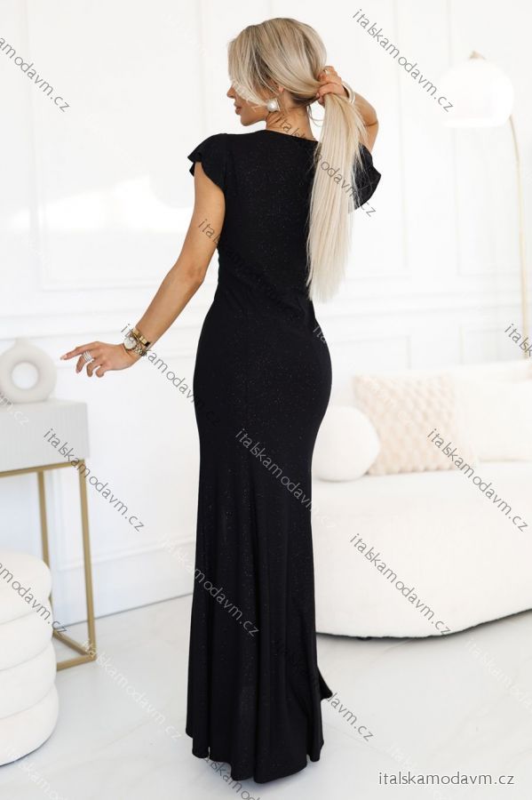 598-1 IRINA oslnivé dlouhé černé šaty s třpytkami, zavinovacím výstřihem a rozparkem na nohavici | Numoco