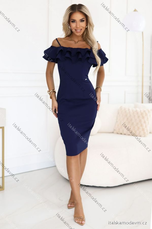 tmavě modré koktejlové šaty, šaty s volánem, pouzdrové midi šaty, elegantní svatební šaty, polský produkt Numoco
