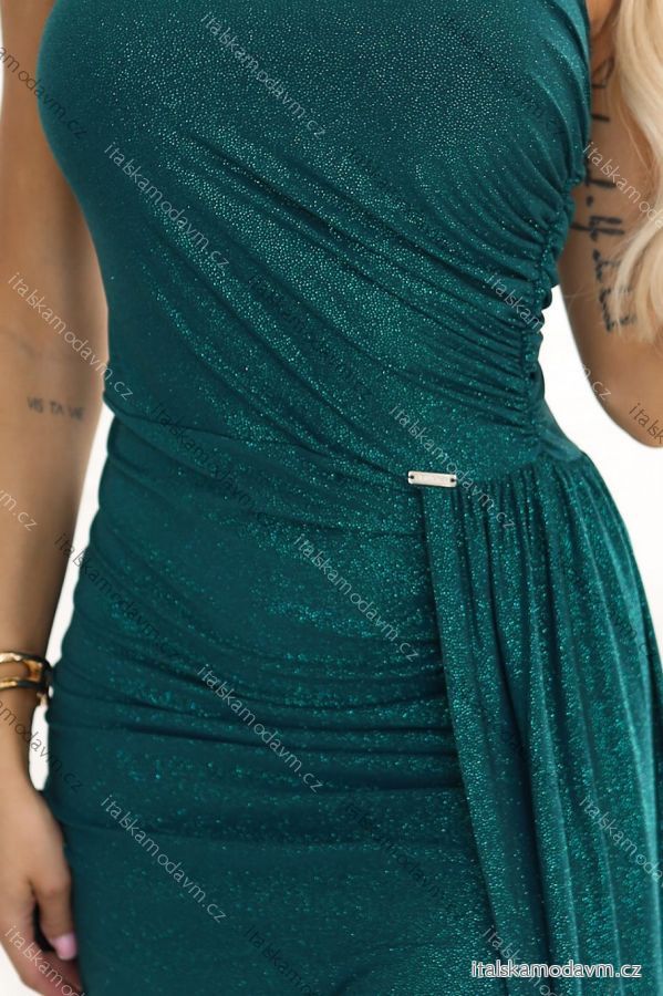 600-2 SELENA třpytivé dlouhé šaty na jedno rameno s rozparkem - zelené s třpytkami