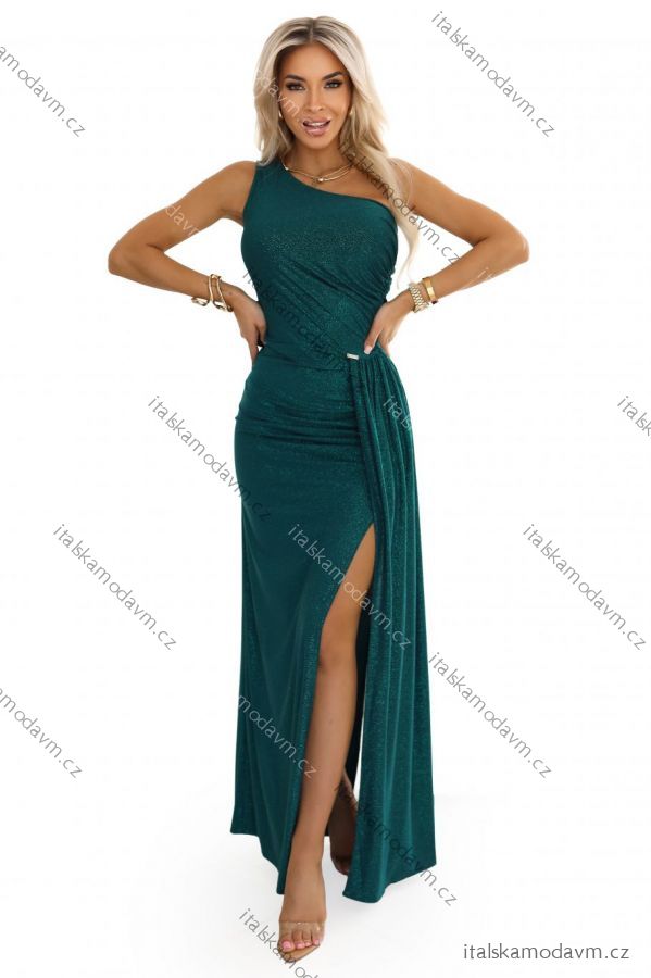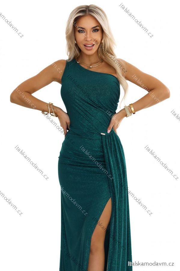 ZBOŽÍ (22043) > 600-2 SELENA třpytivé dlouhé šaty na jedno rameno s rozparkem - zelené s třpytkami