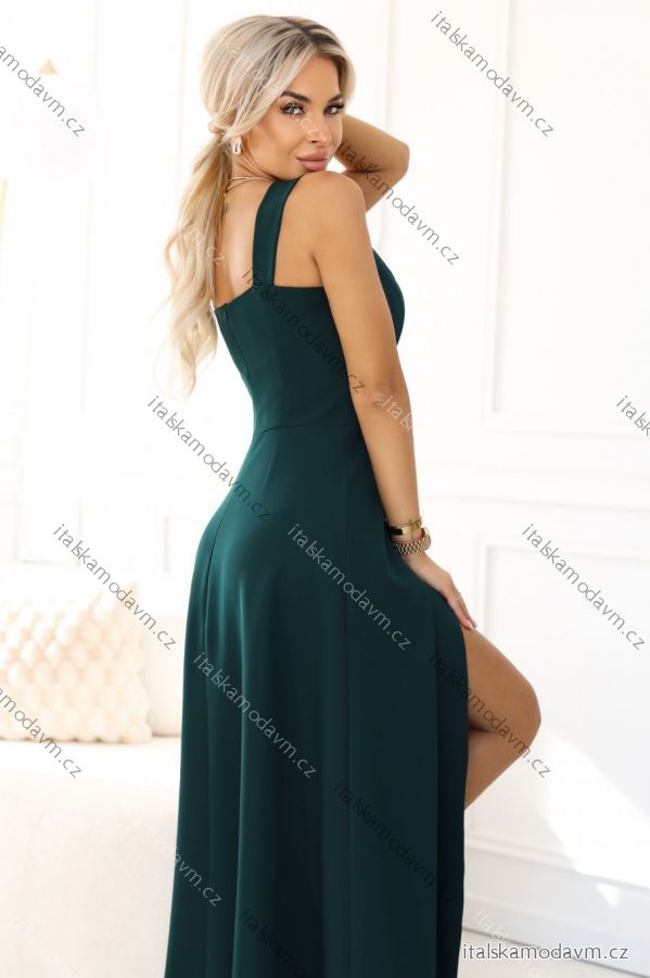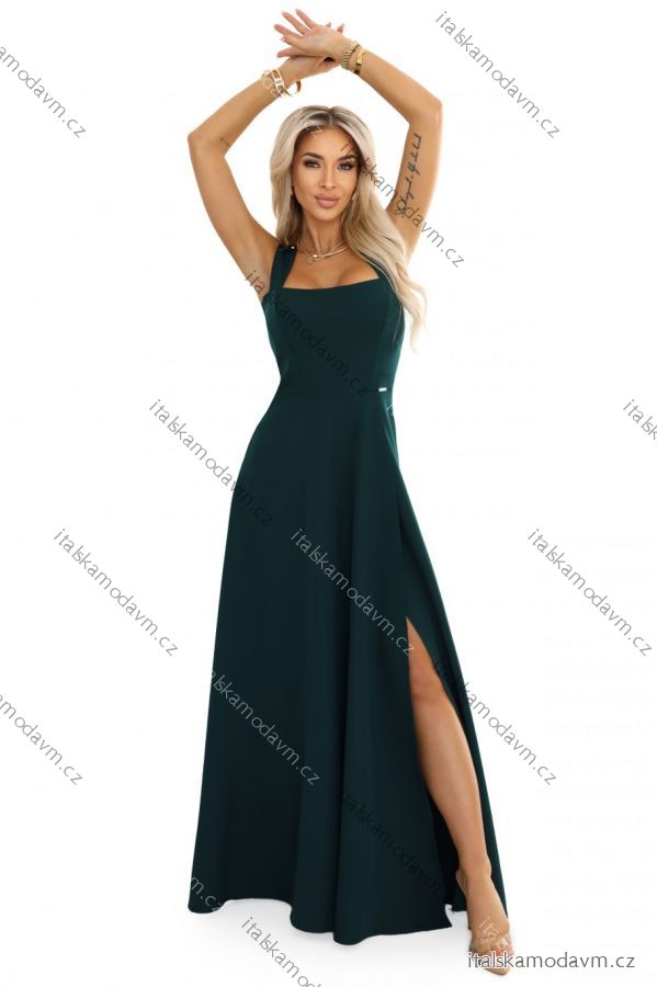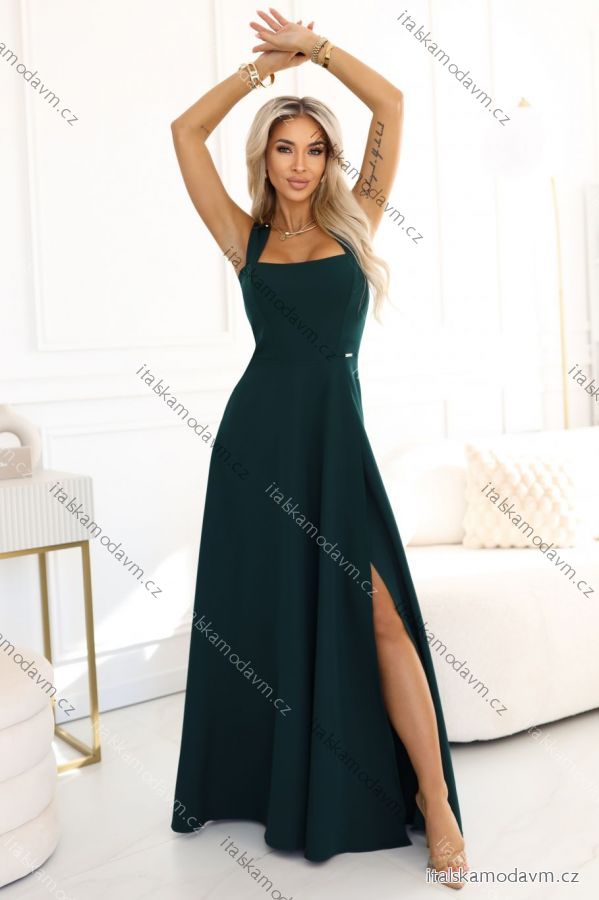 ZBOŽÍ (22043) > 633-2 AURELIA dlouhé šaty s rozparkem na nohavici a diamantovým výstřihem - lahvově zelené