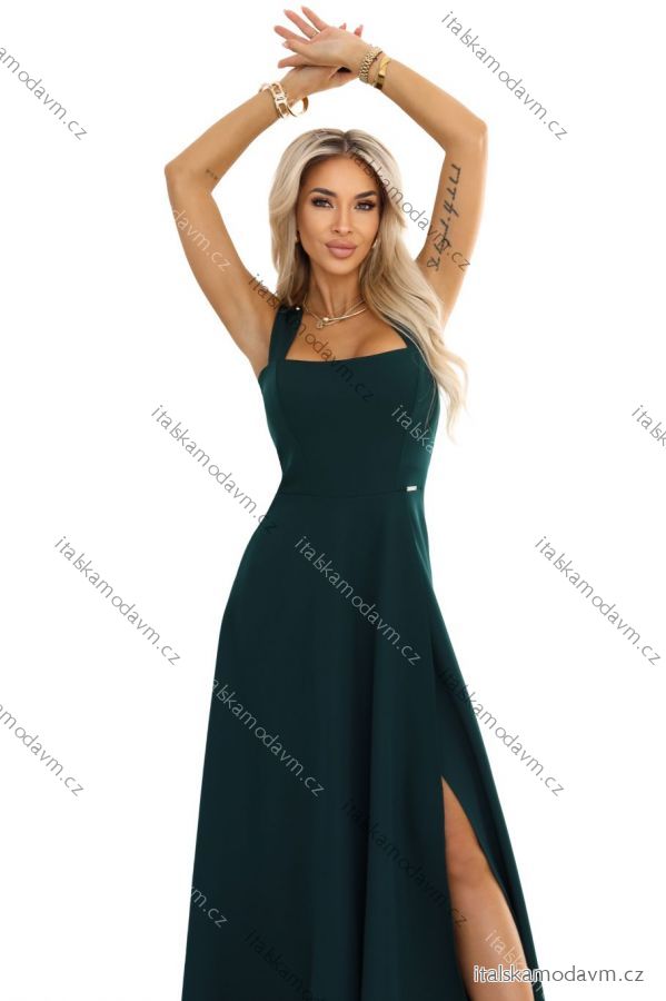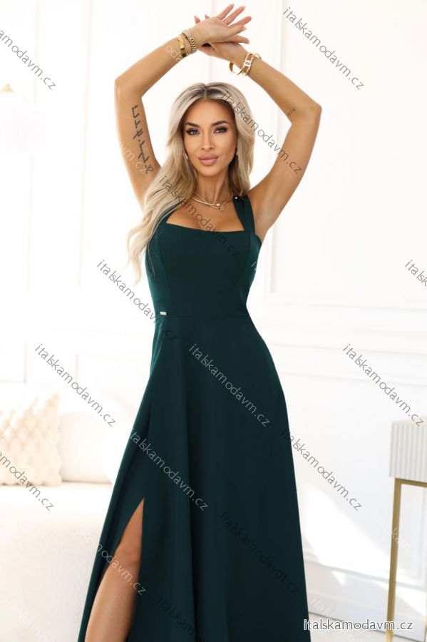 Elegantní maxi šaty s hranatým výstřihem a rozparkem - lahvově zelené | Numoco