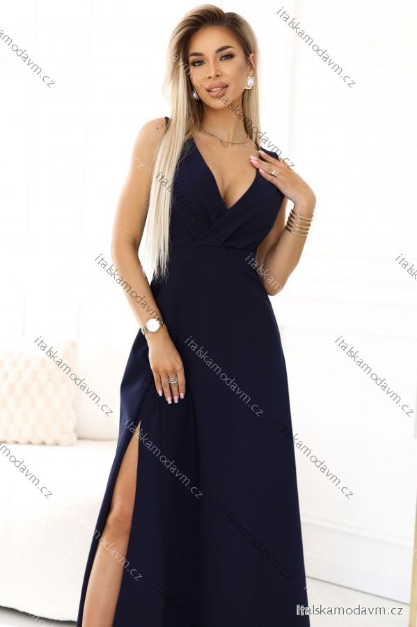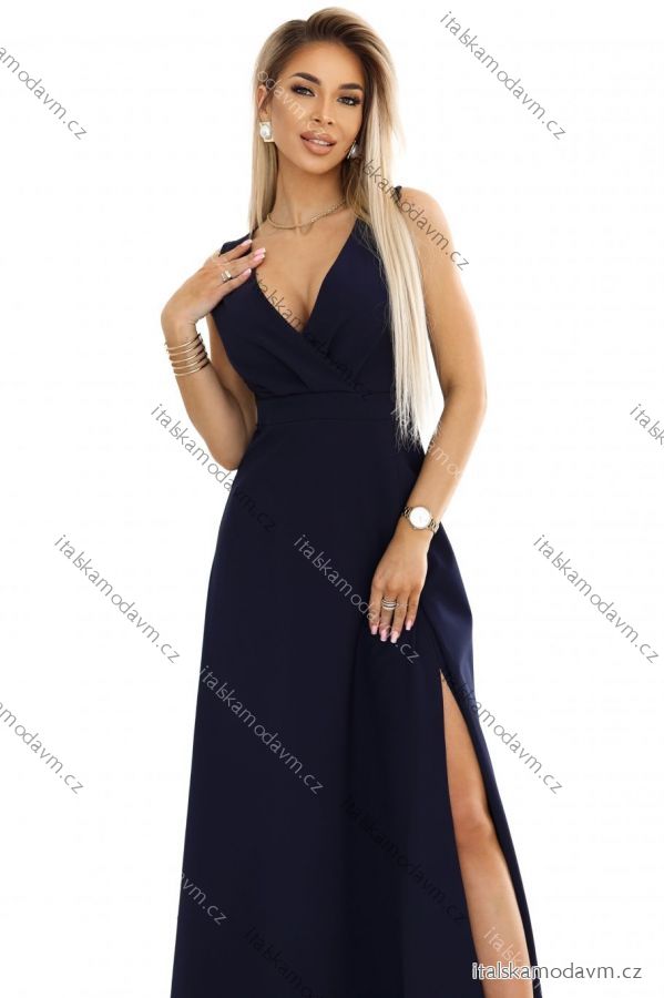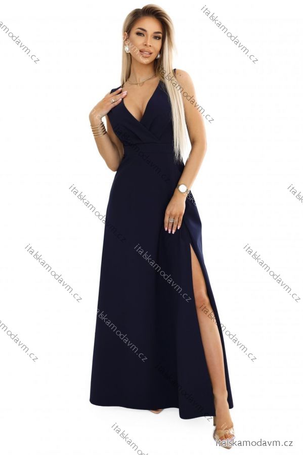 ZBOŽÍ (22043) > 634-1 MIRA elegantní maxi šaty s zavinovacím výstřihem a rozparkem na nohavici - tmavě modré