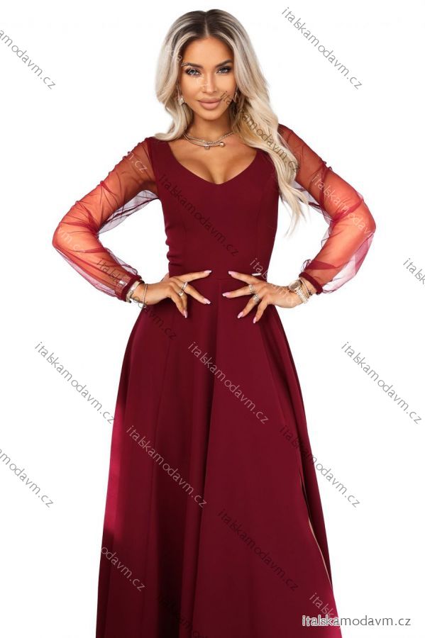 Elegantné bordové maxi šaty s tylovými rukávmi - zmyselná klasika od Numoco