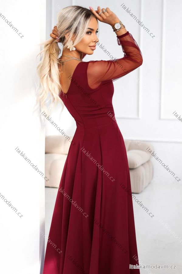 Elegantní vínové maxi šaty s tylovými rukávy - smyslná klasika od Numoco