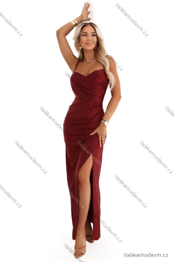 Vínové maxi šaty s ramínky a rozparkem
