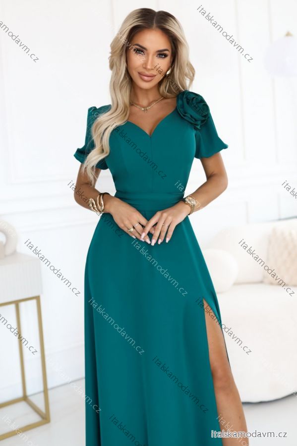 ZBOŽÍ (22025) > Oblečení dámské (17910) > Šaty (9414) > Šaty společenské (3012) > Šaty plesové dlouhé (2010) > 653-1 Elegantní dlouhé šaty s růží, páskem a vysokým rozparkem - lahvově zelené