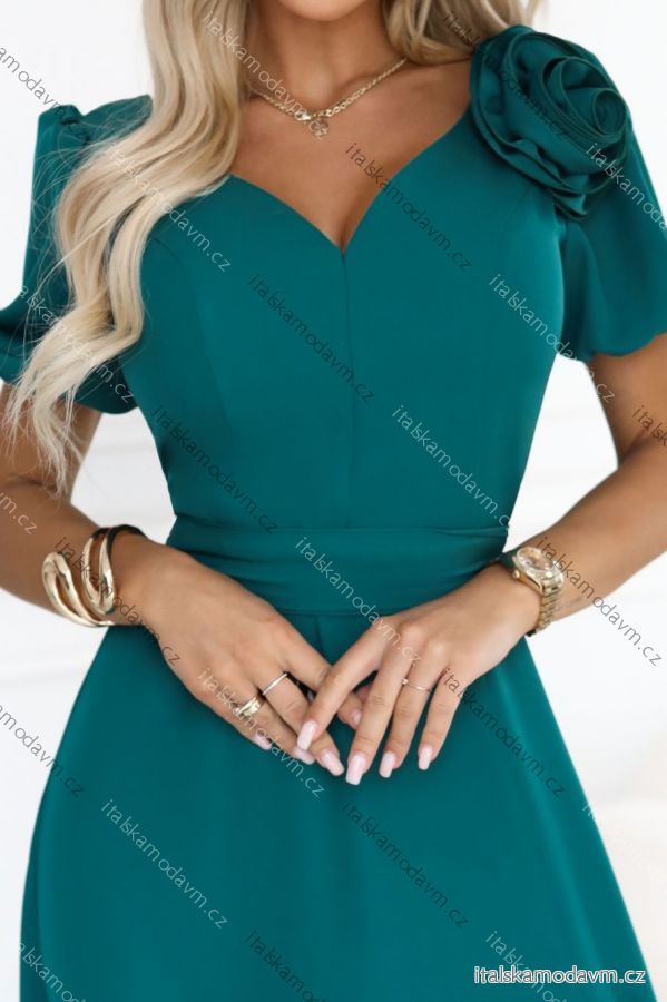 Dlouhé elegantní šaty s růží na ramenou - lahvově zelené - Numoco