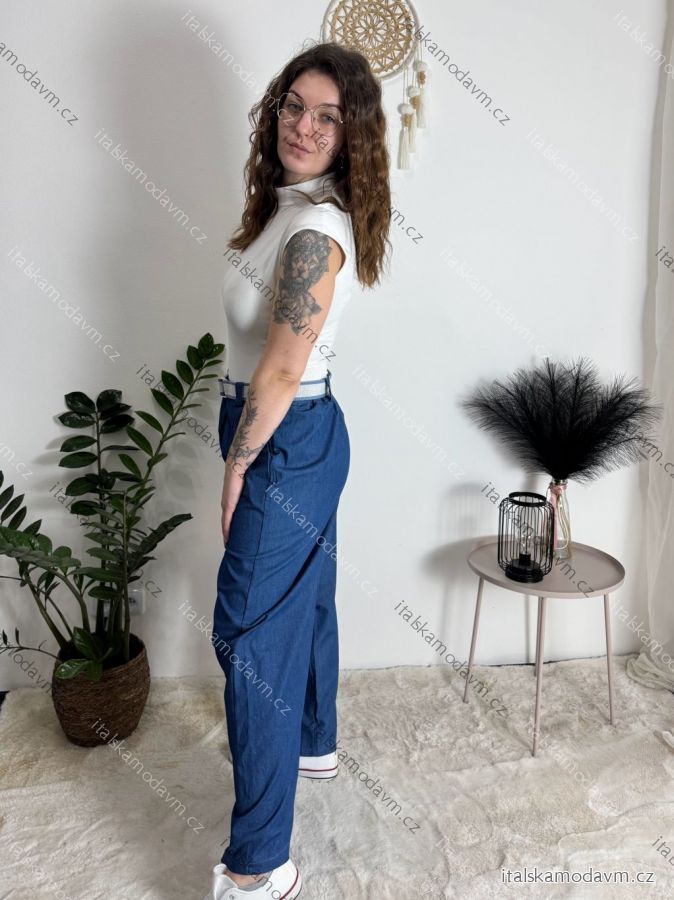 Kalhoty dlouhé letní riflové s páskem dámské PALAZZO (S/M/L ONE SIZE) ITALSKÁ MÓDA IMWCL251061/DUR tmavě modrá S/M/L