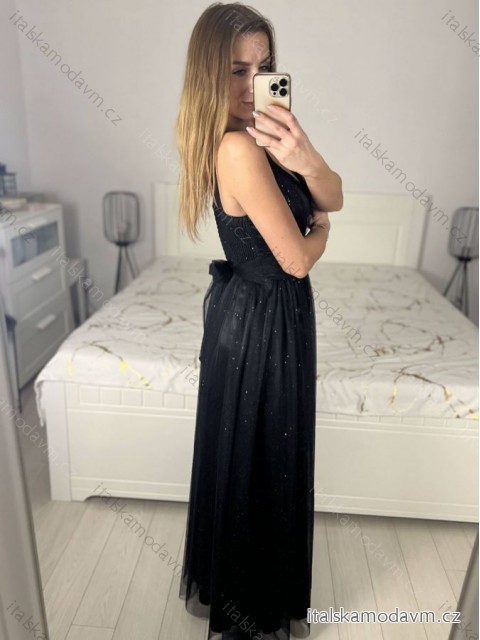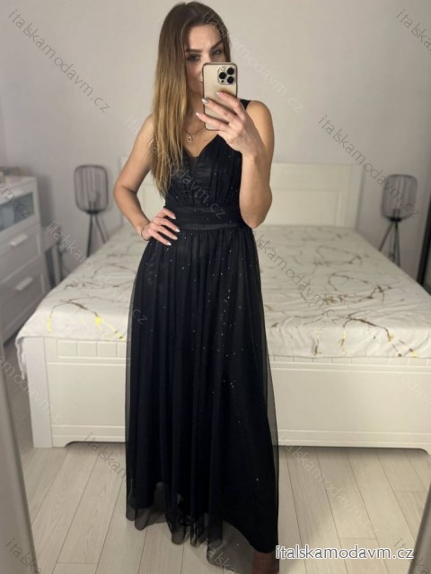 Šaty dlhé třpytivé spoločenské na ramienka dámske (S/M/L ONE SIZE) TALIANSKA MÓDA IMC23480/DUR čierna M / L