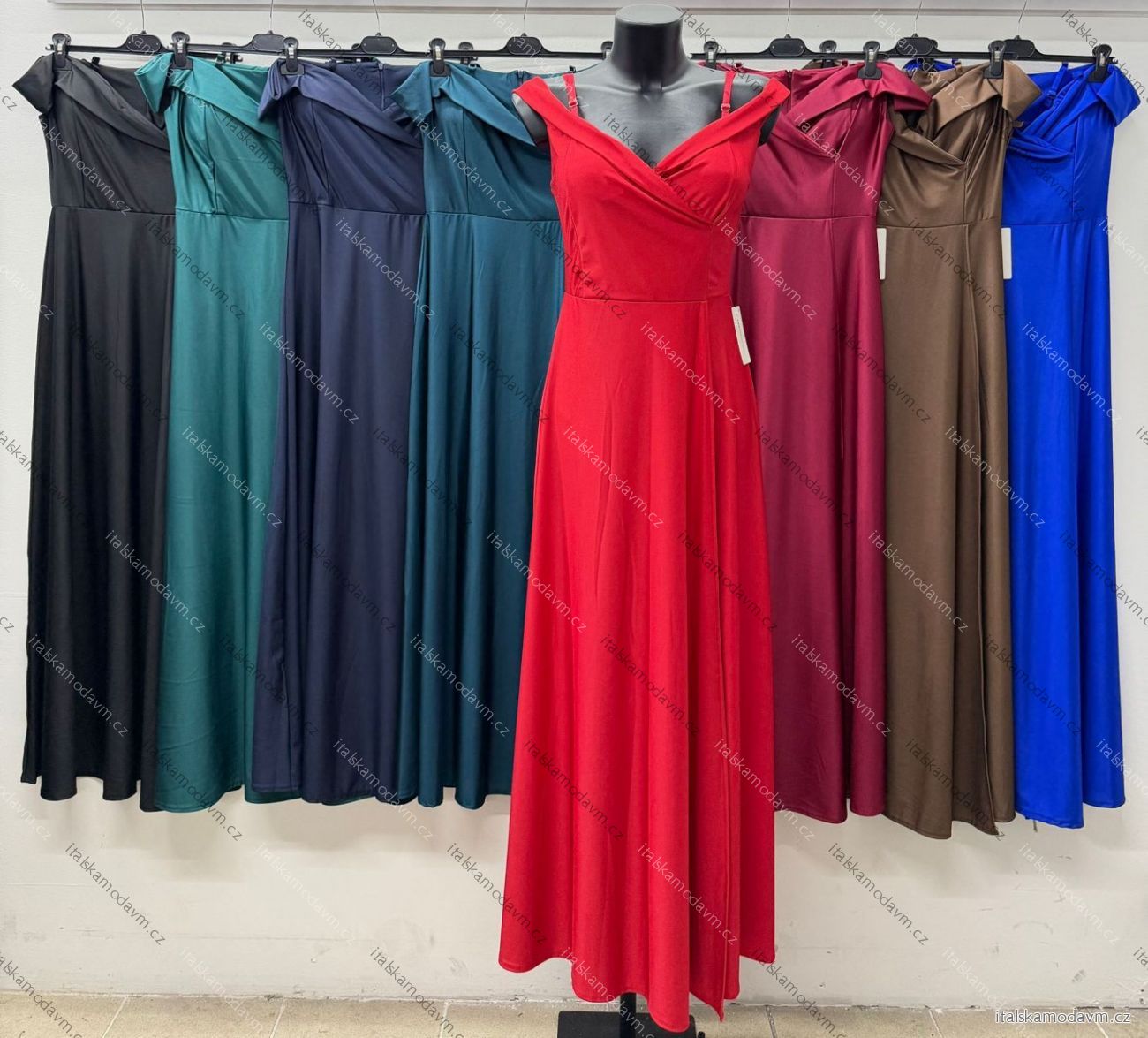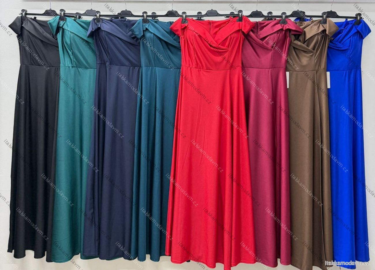 ZBOŽÍ (21828) > Šaty dlouhé společenské carmen dekolt saténové dámské (S/M/L ONE SIZE) ITALSKÁ MÓDA IM425892