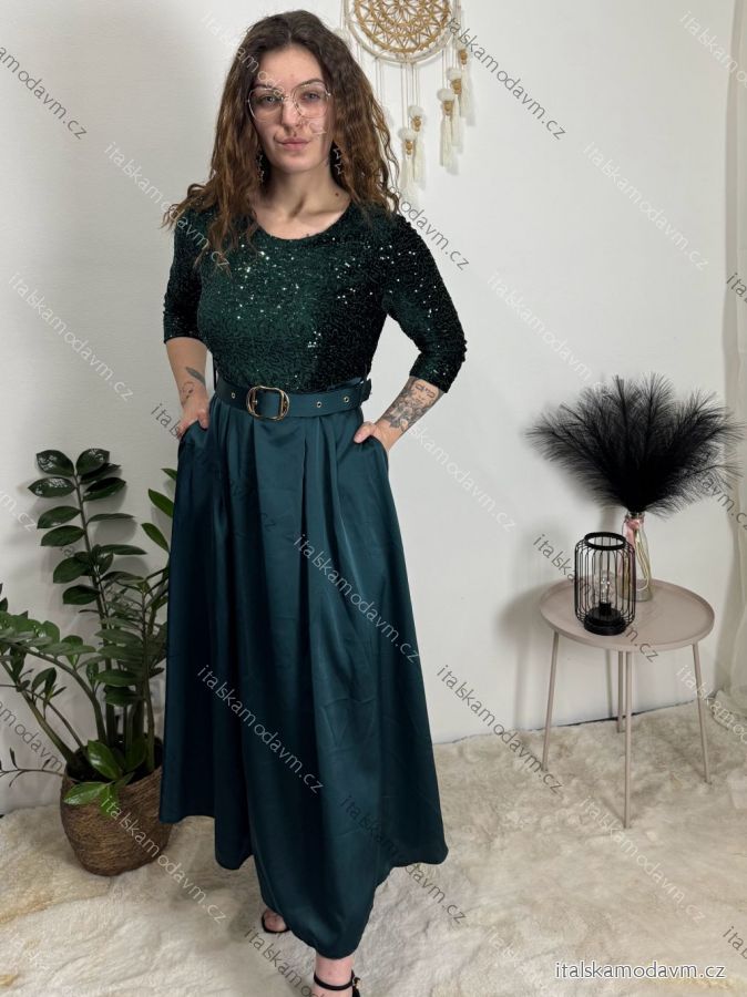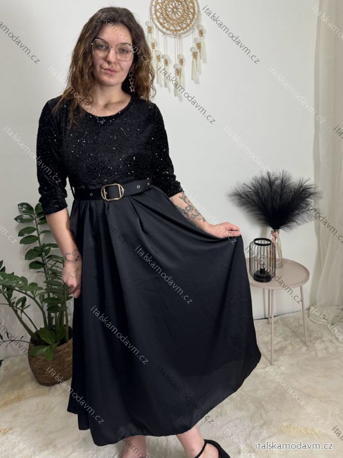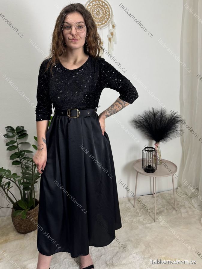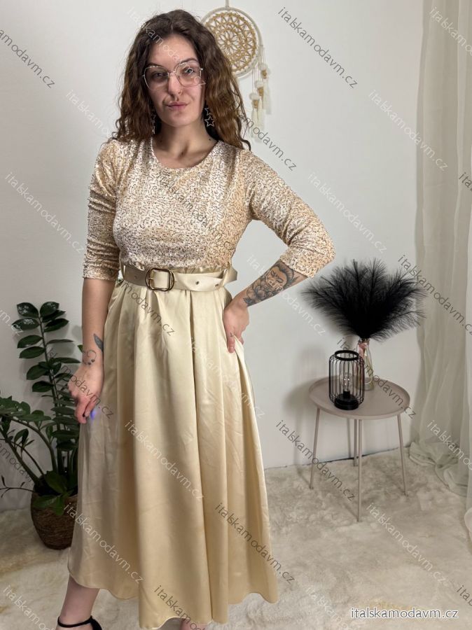 Šaty dlouhé společenské flitrové s páskem dlouhý rukáv dámské (XS/S/M ONE SIZE) ITALSKÁ MÓDA IMM25M13302/DUR béžová XS/S/M