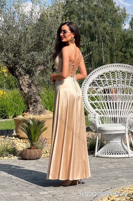 Šaty dlouhé společenské saténové na ramínka dámské (34-42) POLSKÁ MÓDA PMLEL24NATHALIEA béžová 38