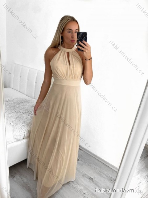 Šaty dlouhé tylové společenské bez rukávu dámské (S/M ONE SIZE) ITALSKÁ MÓDA IMM24M156/DUR - béžová - S/M
