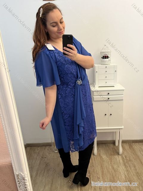 Šaty elegantné spoločenské, dámske nadrozmer, zdobené brošňou a čipkovou