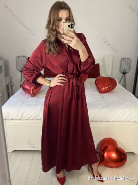Dlouhé elegantní šaty saténové s dlouhým rukávem, V výstřihem a zavazovacím páskem