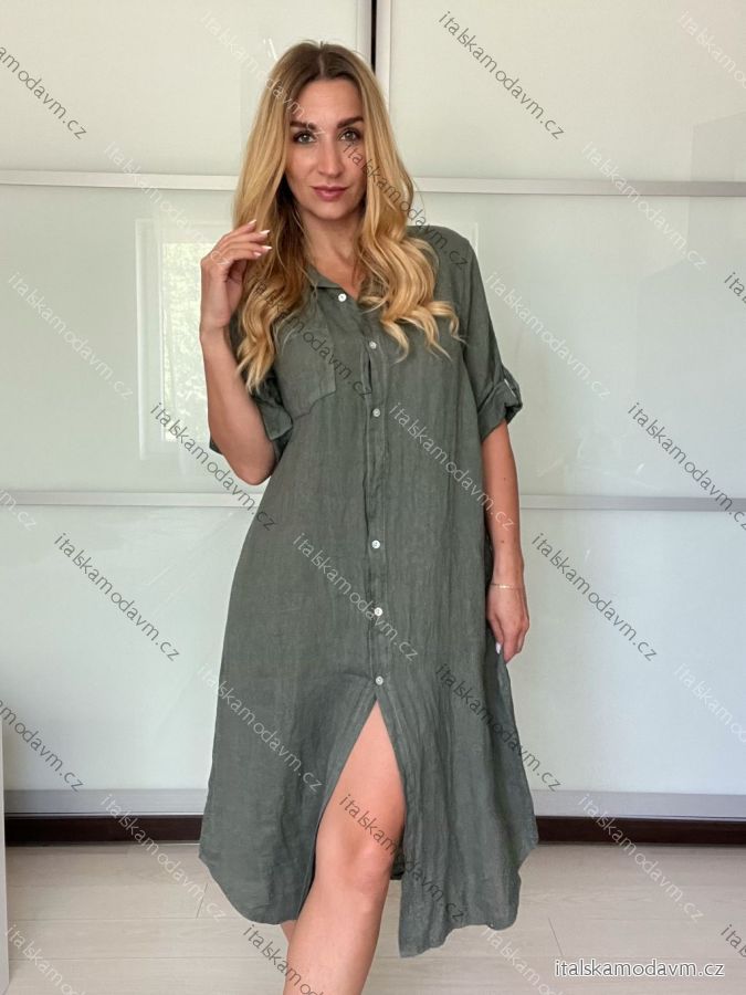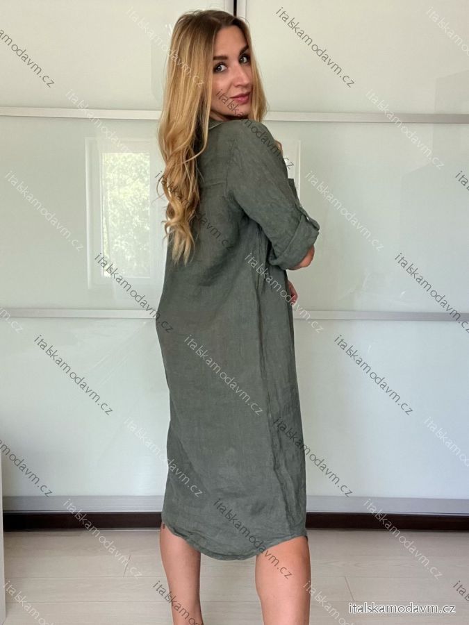 Šaty košeľové ľanové 3/4 dlhý rukáv dámske (S/M/L ONE SIZE) TALIANSKA MODA IM725157/DU - zelená khaki - S/M/L