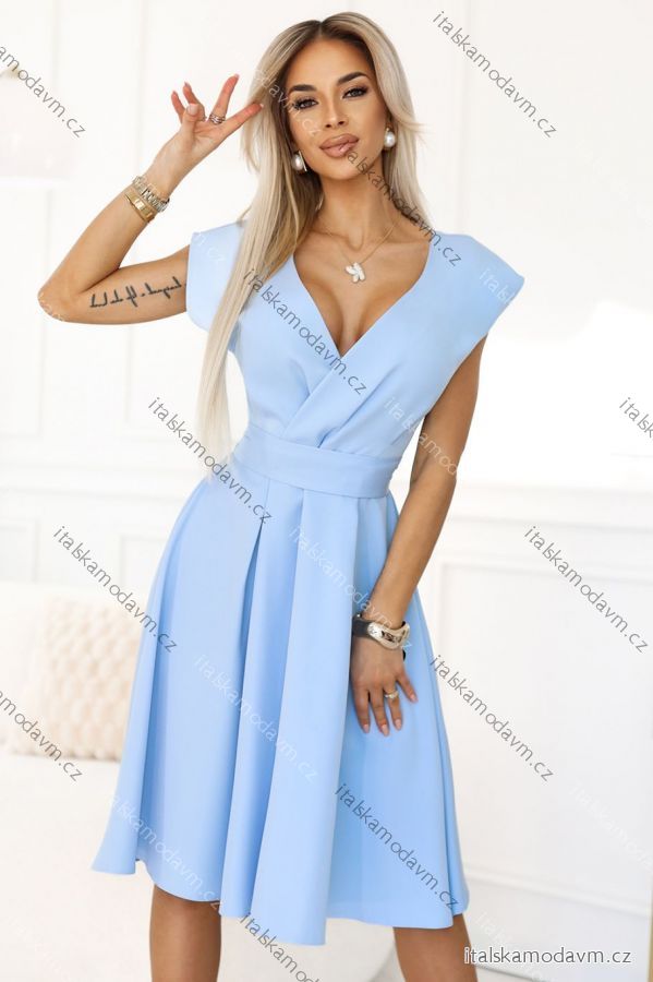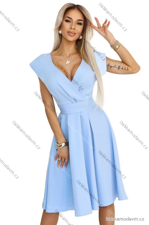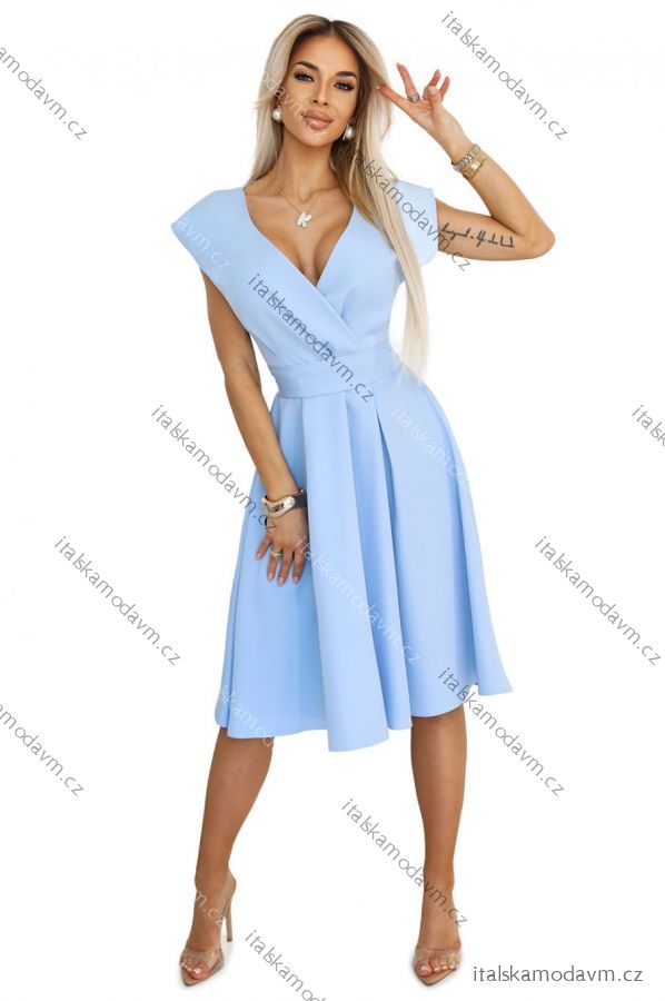 Šaty midi s psaníčkovým výstřihem krátký rukáv dámská móda SCARLETT (S - 2XL) Polská móda NMC-348-12/DR světle modrá S