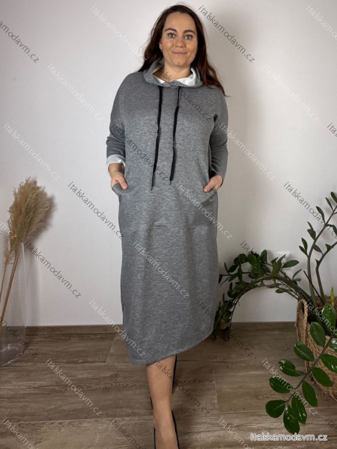 Šaty mikinové s kapucí a kapsami dlouhý rukáv dámské nadrozměr KARLA (54/56/58 ONE SIZE) ITALSKÁ MÓDA IMD25159/DU 54/56/58 šedá