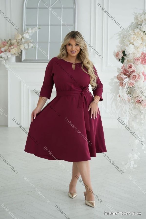 Šaty s páskem elegantní 3/4 rukáv dámské nadrozměr (38-48) POLSKÁ MÓDA PMLLD255056-2/DU 46 vínová
