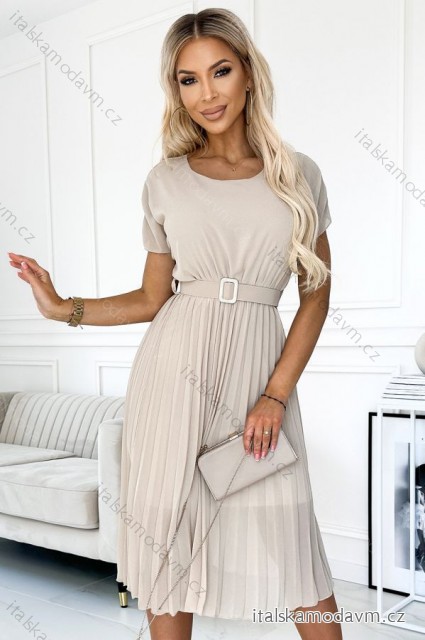 Plisované šaty MIA s kulatým výstřihem, širokým páskem a krátkými rukávy. Vyrobeno z béžového šifonu s podšívkou. Perfektní šaty pro každou příležitost. Značka Numoco . evropská produkce. Plisované midi šaty - béžové
