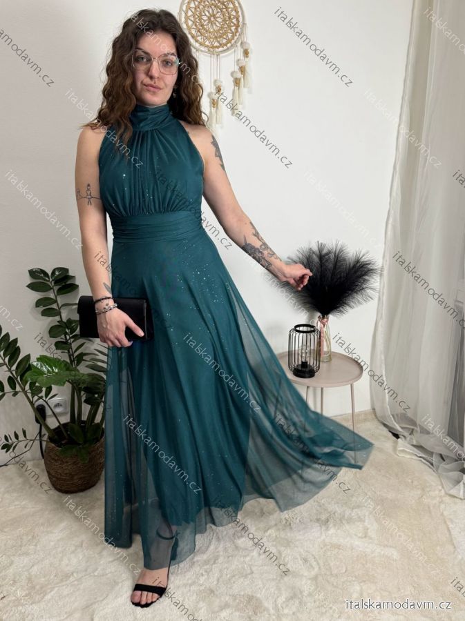 Dlouhé společenské šaty bez rukávu, se zapínáním za krkem na knoflíček. Šaty mají prsní vycpávky