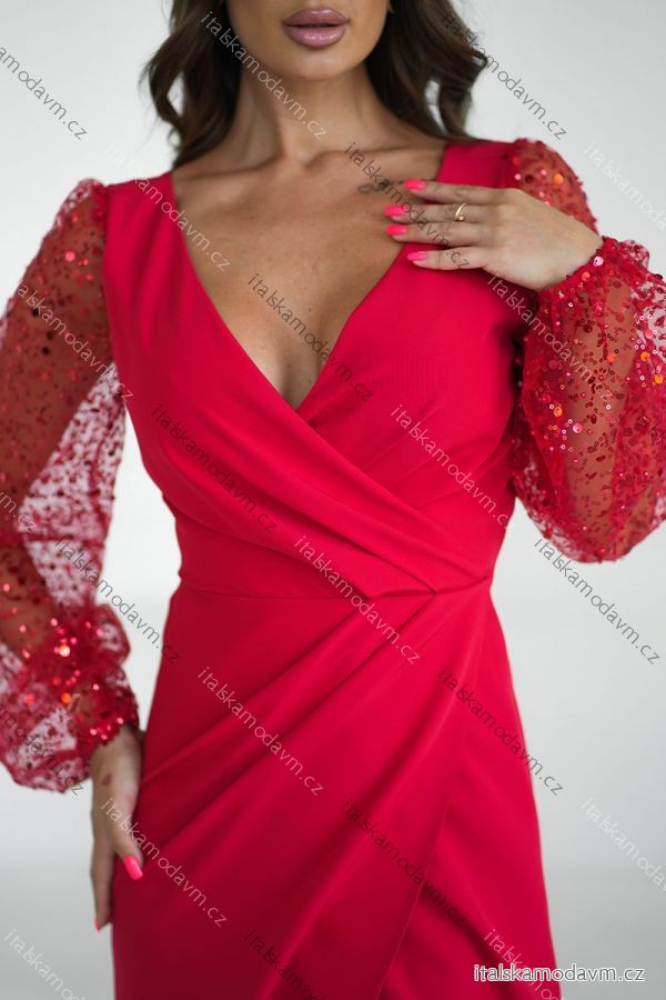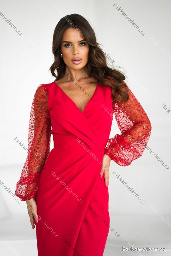 Šaty spoločenské dlhý rukáv dámske (34-48) POLSKÁ MÓDA PMLBC25314-02 červená 36
