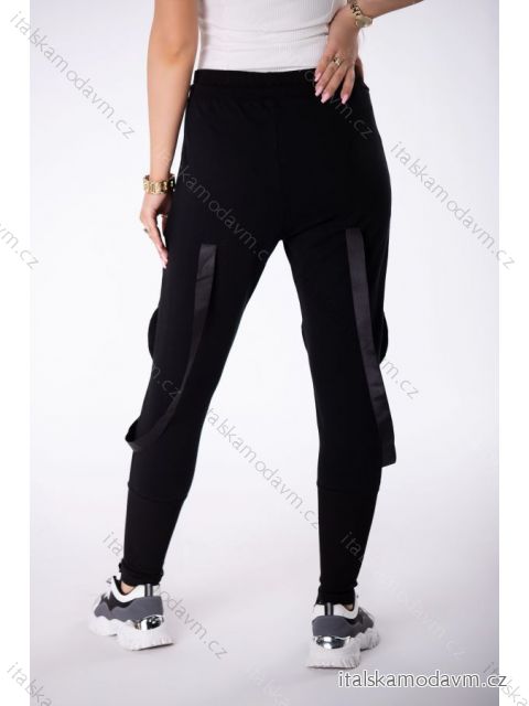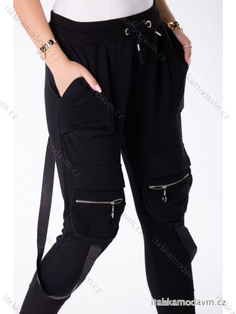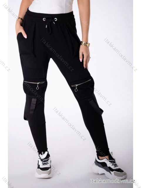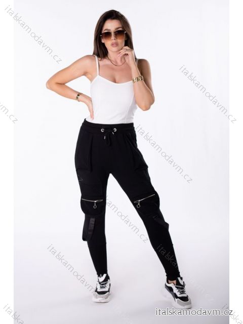 Tepláky z kvalitní bavlny s příměsí elastanu. Štěrbinové kapsy na bederní linii a našité kapsy na stehenní linii, zdobené zipy a popruhy směřujícími k zadní části modelu. Úzké nohy zakončené širokým lemem. Model, který bude použit v každodenních stylizacích se sportovní barvou.